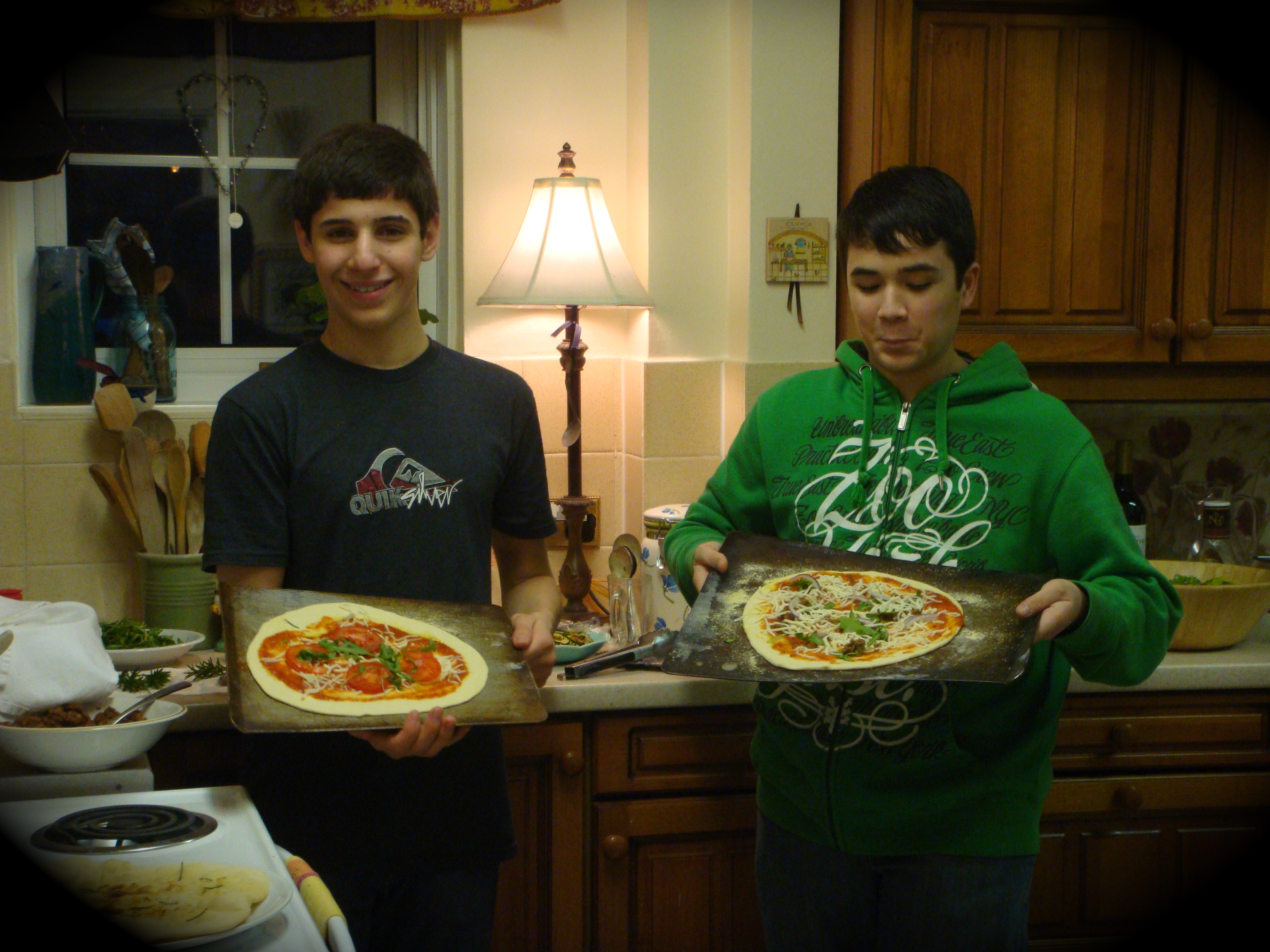 gabe and his first homemade, wood-fired pizza.