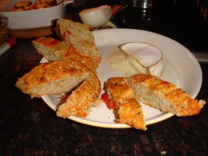 Mix 1 cup of bread flour, wheat flour, yeast, salt and sugar in a large bowl. Add pesto and warm water; stir until smooth. Mix in tomatoes. Stir in remaining flour. Cover with tea towel or plastic wrap, let rise until doubled in size. Prepare baking pan with parchment paper, sprinkle with corn meal. When dough has finished first rising, gently push dough down. Shape into rustic loaf on baking sheet, cover and let rise until doubled. Heat oven to 375. Bake bread for 35 – 40 minutes or until loaf sounds hollow when tapped. Remove from oven and baking sheet immediately to cool on wire rack.