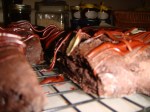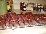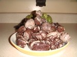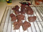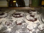 This time however, I wasn’t smart enough to make a small batch for my first trial ~ yes, I think my kitchen ego got the best of me. After the first dozen monster-doughnuts and two dozen ghoulish-doughnut holes(eek!), I glanced in my bowl and realized with horror that I still had over half of the dough!@#ee! Toren tasted one before heading out to play soccer… I must say he was rather gentle with my feelings, as he said, “yeah, they taste like a fried brownie”. Not what I was going for when I thought of chocolate doughnuts! What to do, what to do? It was almost the right consistency for biscotti, so I made some minor adjustments (adding slivered almonds and some chopped Perugina chocolate) patted out two long logs of dough onto my sheets, did some baking, some cutting, then some more baking, melted some of the aforementioned Perugina chocolate to drizzle over top; lo and behold, I made biscotti from doughnuts ~ not all was lost after all!