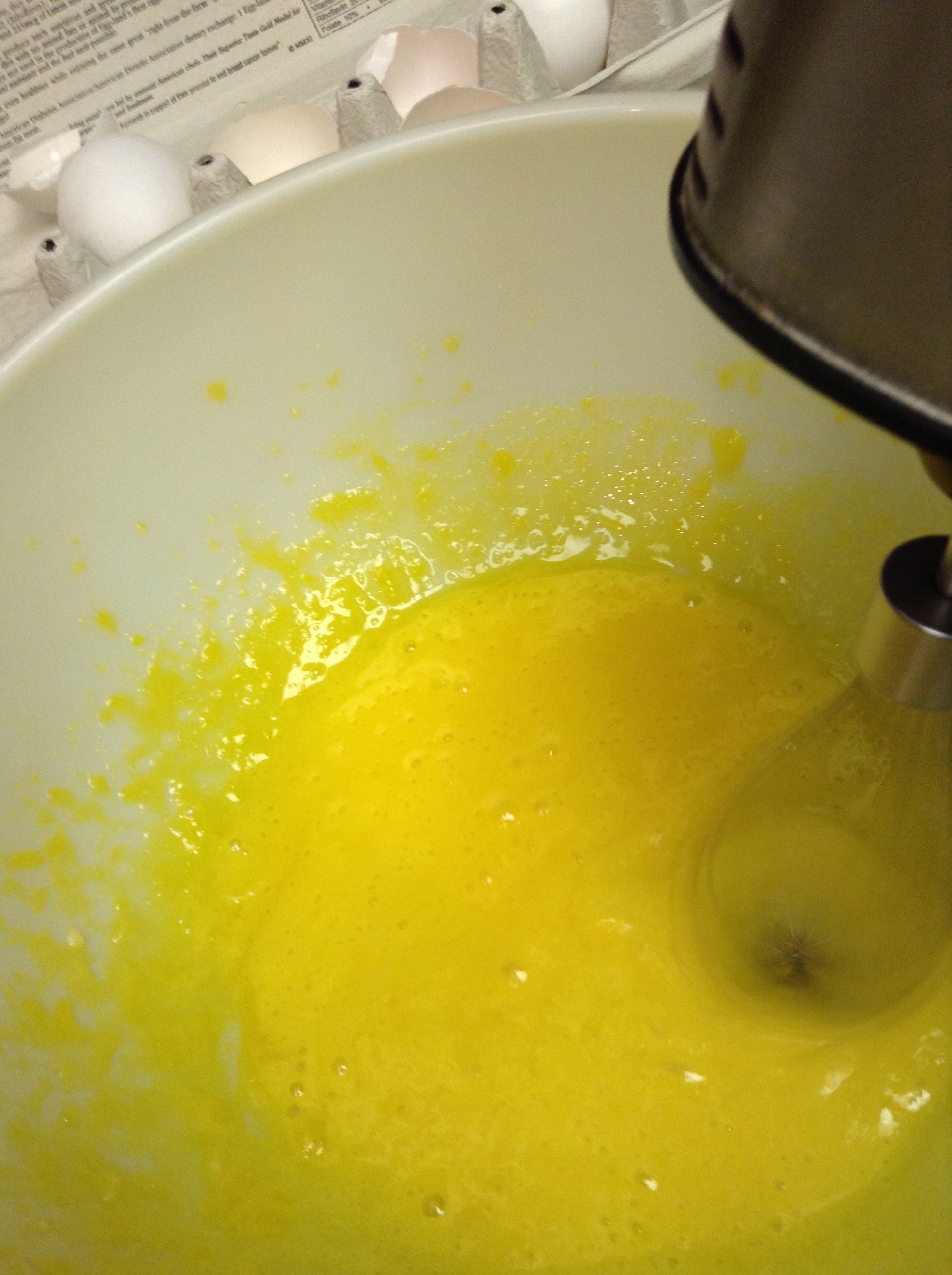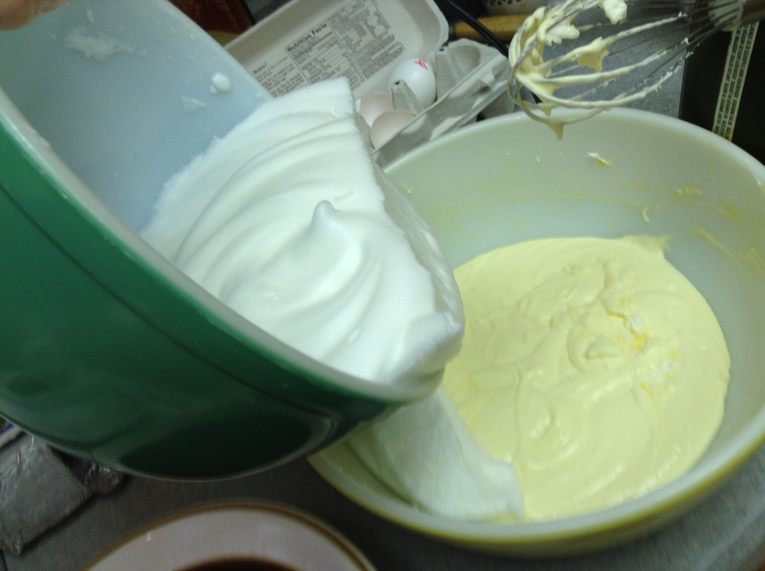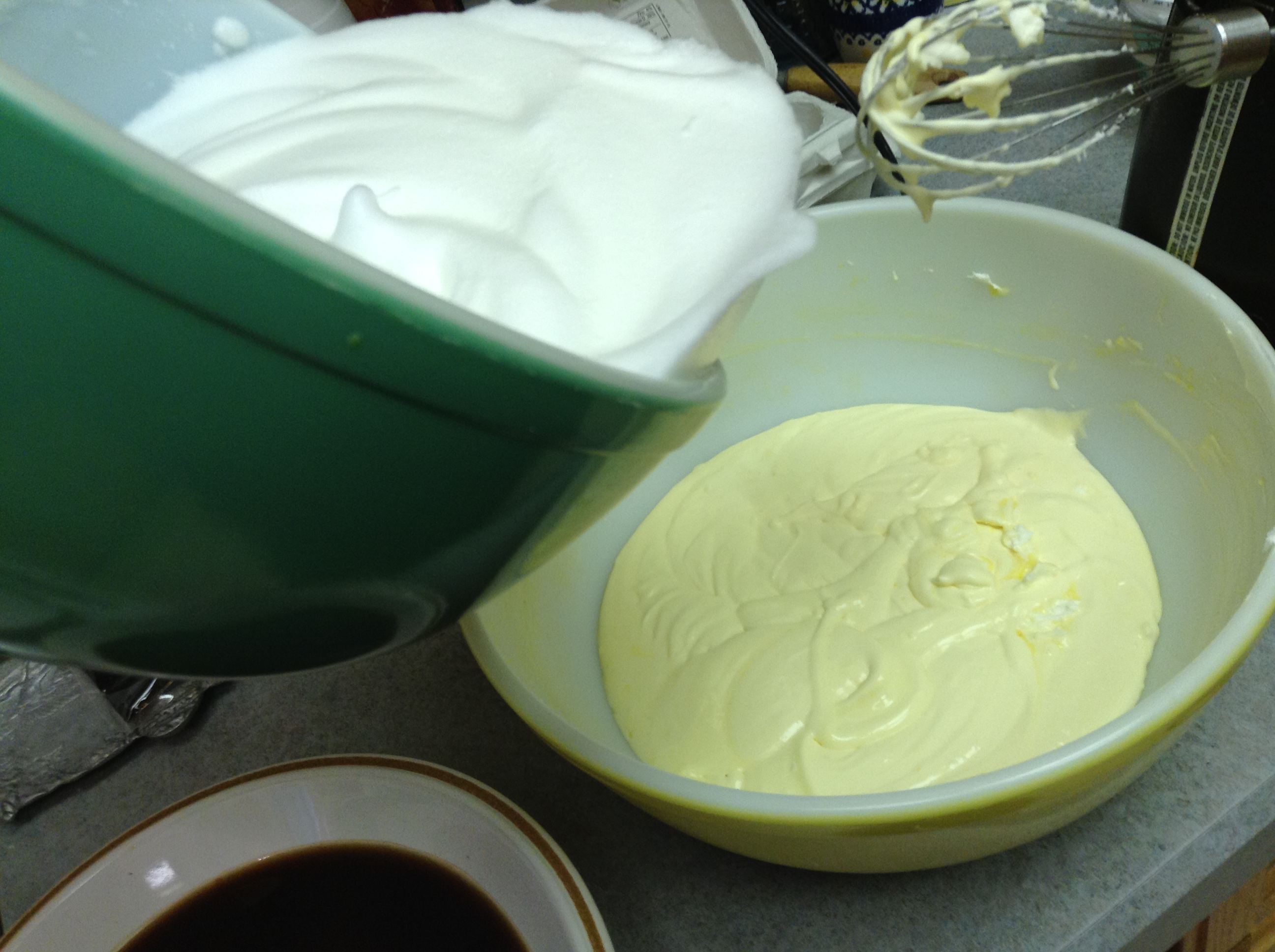 You will need 2 large bowls for the eggs and 1 shallow bowl for the cooled coffee/espresso ~ separate eggs in large bowls (whites in one, yolks in the other); add 4 T sugar to the yolks and whip until pale yellow and thickened. Slowly incorporate mascarpone; mix until combined.