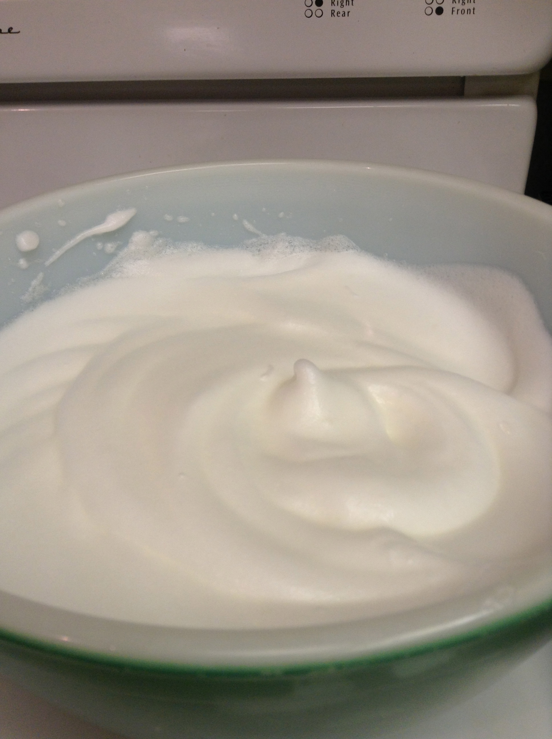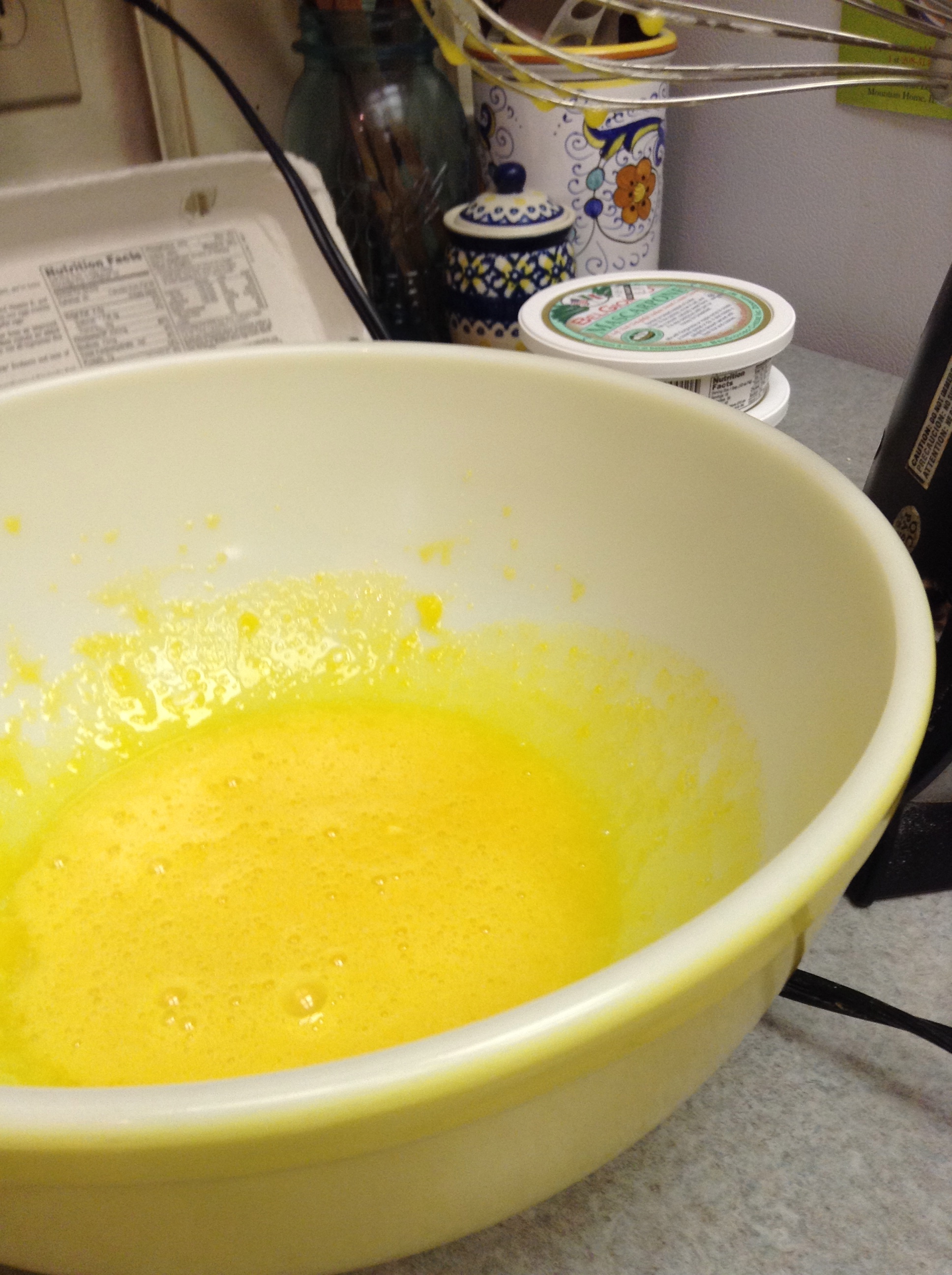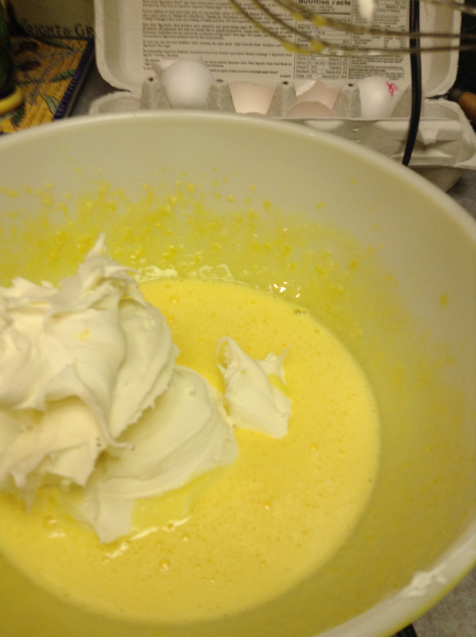 You will need 2 large bowls for the eggs and 1 shallow bowl for the cooled coffee/espresso ~ separate eggs in large bowls (whites in one, yolks in the other); add 4 T sugar to the yolks and whip until pale yellow and thickened. Slowly incorporate mascarpone; mix until combined.
