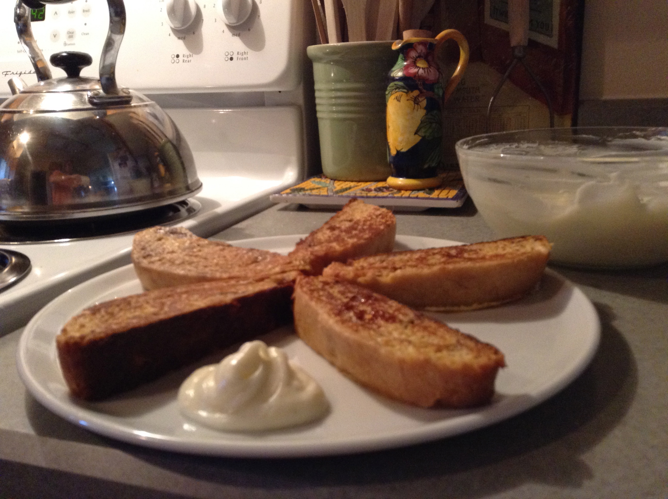 Turn risen dough out onto lightly floured surface; separate into 4 sections (make traditional cinnamon rolls with the other 3 sections); roll one portion at a time into a long rectangle; spread 2 T softened butter over dough; sprinkle with 2-3 T cinnamon-sugar mixture; from long end, roll tightly; place on parchment lined baking sheet, cover and allow to rise for 1 hour. Bake at 350 for 25-30 minutes. Let cool on wire rack. Slice into 1/2 inch – 1 inch slices; dip into French Toast mix (2 eggs, 2 T milk, 1 tsp vanilla extract, dash of cinnamon), place on hot griddle, cooking about 1 minute per side. Serve with vanilla bean cream cheese butter (scrape 1/2 vanilla bean, 1-8 oz pkg cream cheese, 4 T butter, 3/4 c confectioner’s sugar; combine in a medium bowl; whisk until combined) enjoy! V ~