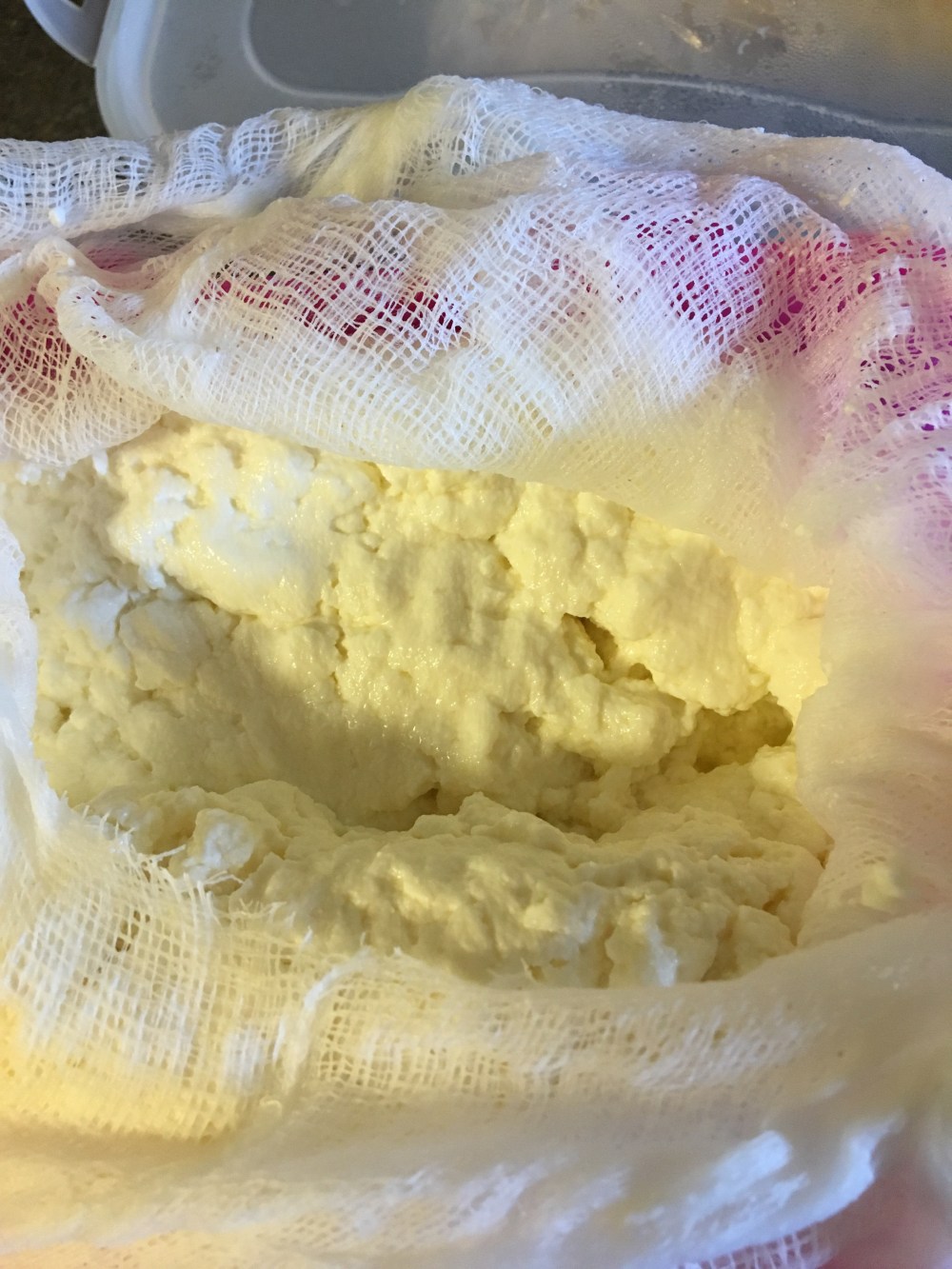 For “aged” or dried ricotta, squeeze excess liquid from cheese. Keep wrapped in cheesecloth, weigh down by placing a small plate over top then put a can of tomatoes on top of the plate. (You can use any canned vegetable, I just happen to only have tomatoes on hand!)