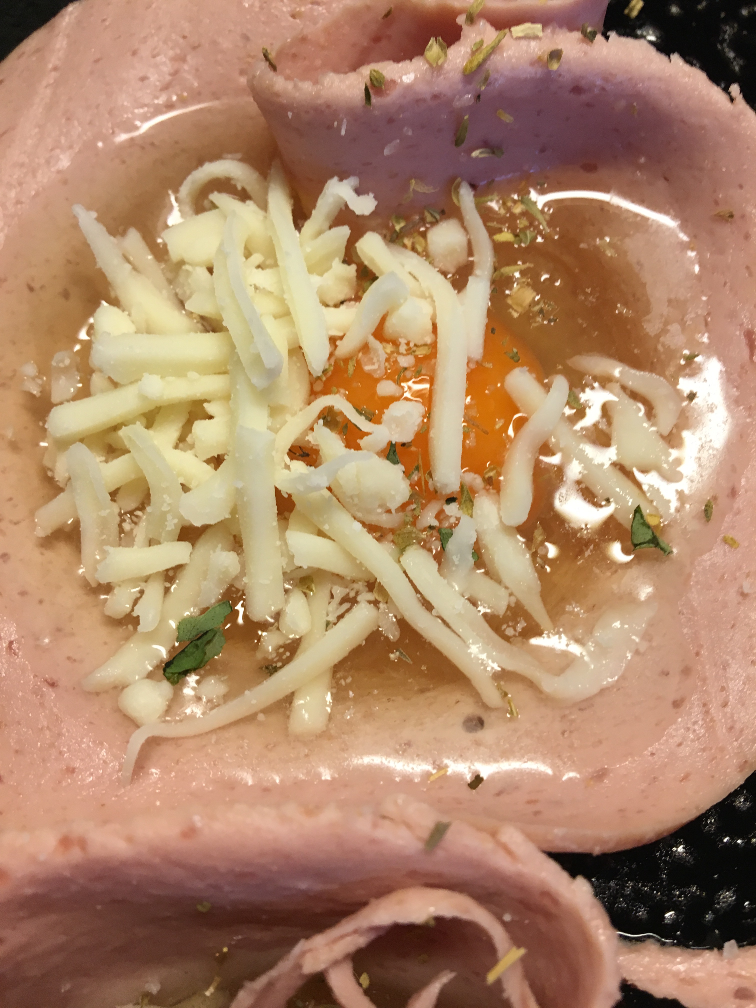Preheat oven to 425. Spray standard muffin tin with nonstick spray; line each cup with meat, pushing down to creat a cup for your egg. Crack one egg per meat cup; place vegetables on top, if using, sprinkle with herbs, salt and pepper. Top with spoonful of tomato sauce then sprinkle grated cheese over top. Bake for 18-25 minutes, or until eggs are cooked to your liking.