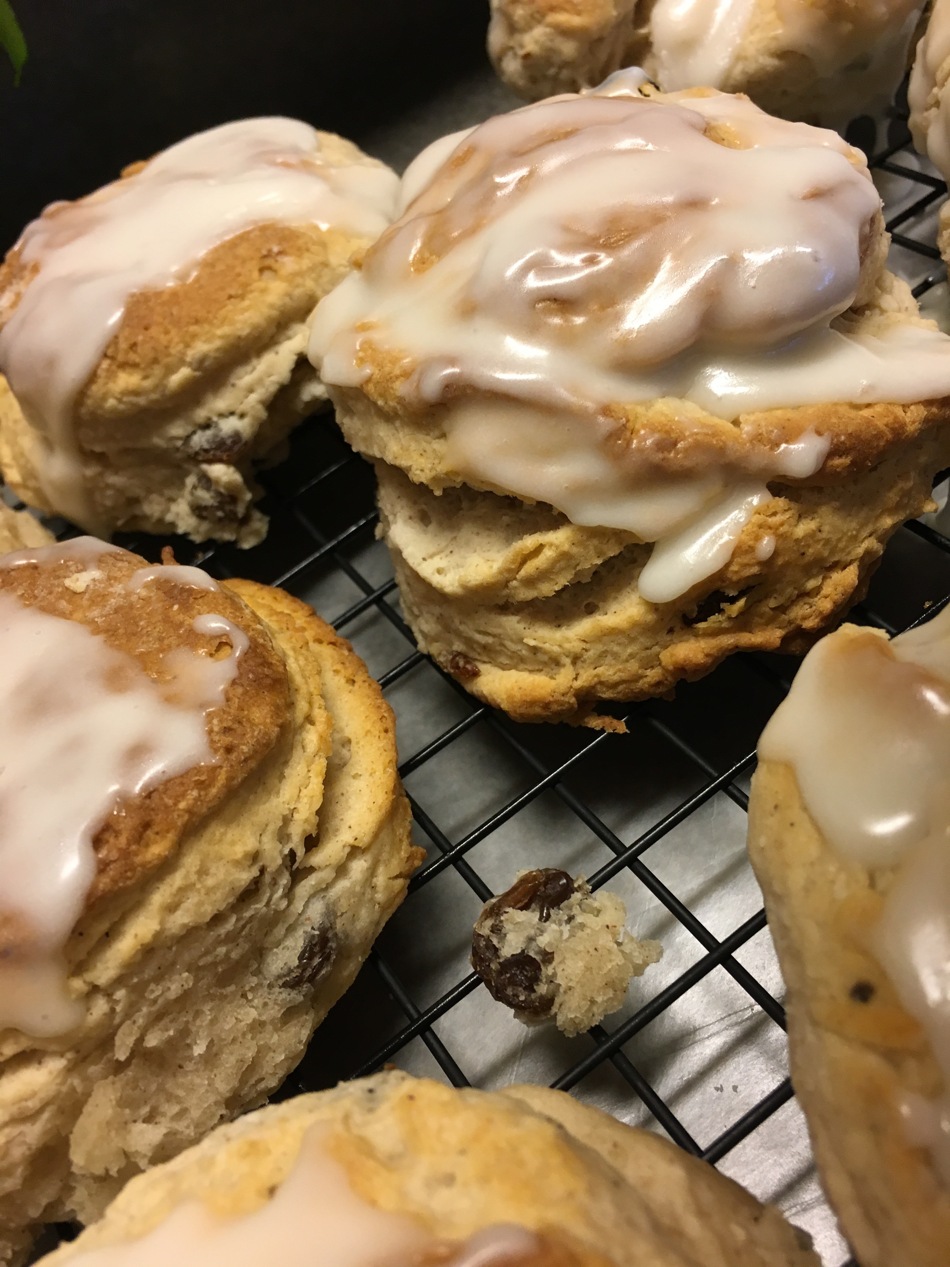 Yes, biscuits! If you’re looking for a good, flakey, layered with butter, cinnamon and raisins biscuit lightly kissed with creamy, silk-like glaze – look no further! Crazy menopausal cravings are worse than the pregnancy ones for me- sweet one minute salty, the next… moist (sorry Tyler) one bite, then crunchy the next… wonderful woes of the woman 💛