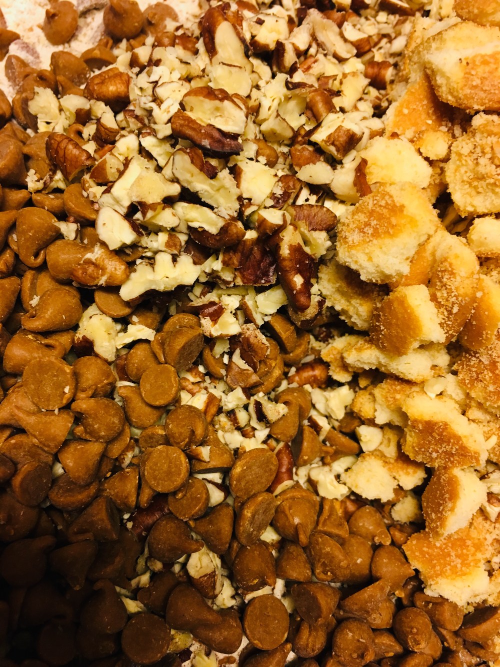 It’s that PCS-hurry-and-use-all-the-ingredients time in the house. Today’s bake was inspired by the lone bag of cinnamon chips and pecans I had in the fridge…and the quarter bag of Nilla wafers that were lurking in the pantry. Yeah, I asked the same question – why do I have a quarter bag of Nilla wafers? Surely I could have fit 13 2/5 wafers in that last batch of banana pudding?!