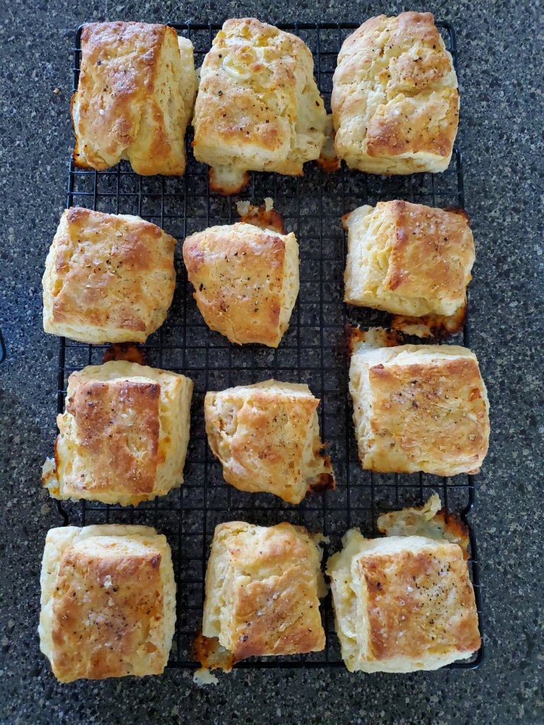 Combine all dry ingredients, mix well. Using a cheese grater, grate 3 T butter into flour, toss with fingers to gently distribute into flour mixture. Pour in 3/4 c milk, gently stirring until dough just starts coming together. Use additional milk to bring in the rest of the flour. Turn dough out onto lightly floured surface; pat into rectangle, about 8 x 14 inches; distribute half of the ham and cheese over dough. Complete a letter fold, press out into a rectangle and using the cheese grater, grate the remaining butter over dough. Complete one more letter fold, press dough into rectangle; using a sharp knife, cut straight down into 12 equal pieces (yes, these are square biscuits…no waste and no tough biscuits from over-working dough). Bake in preheated 475 degree oven for 10-12 minutes. Remove from oven, transfer to cooling rack, wait a few moments then eat ’em up!Stay well.