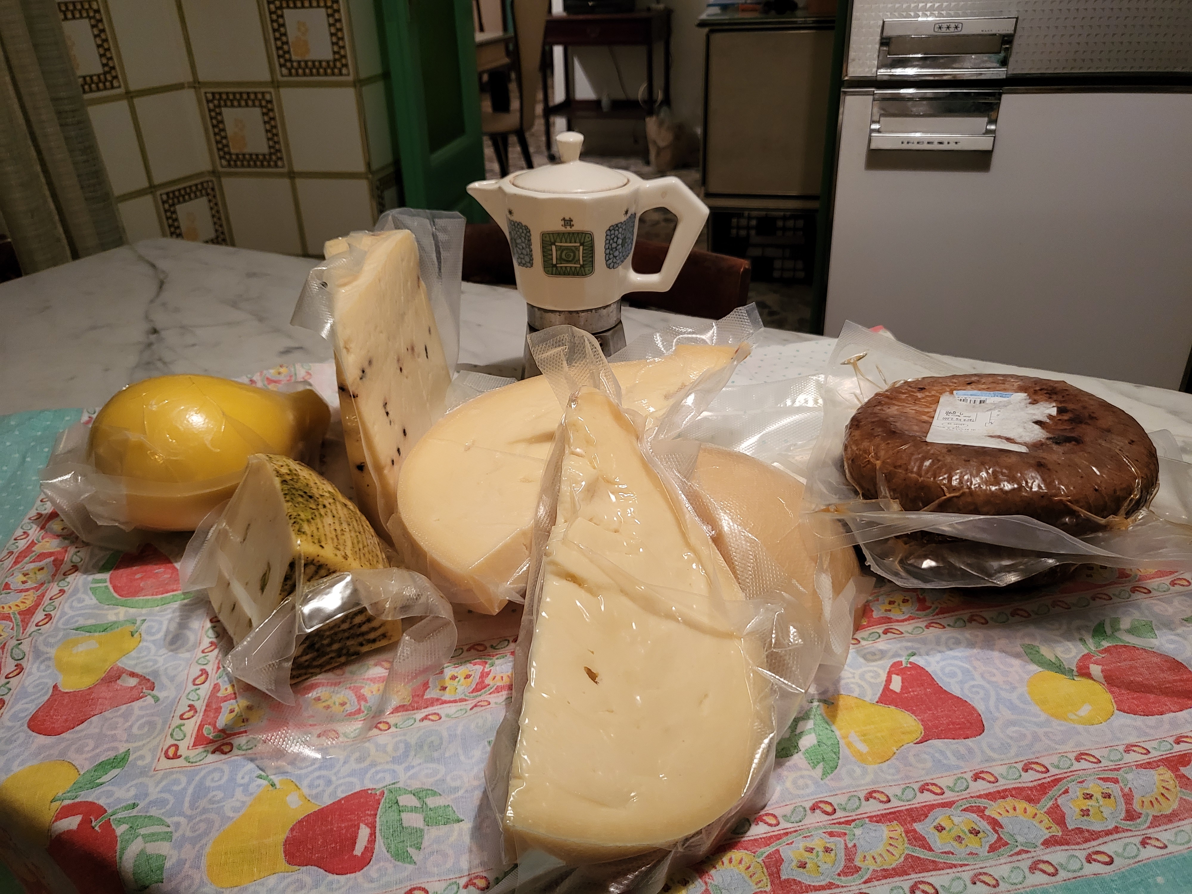 Tonight, Cousin Stefano and new friend, Calogero took us to a small shop run by two brothers, Andrea and Luciano Di Nardo of Macelleria Sfizi Di Carne, tucked away in the hillside of the small Sicilian village of Galati Mamertino… what a treasure this place is! During introductions, Stefano explained that we were interested in trying some of their cheese, and the brothers quietly selected their favorites, and proceeded to share in generous quantities with us: pecorino with peppercorns, pecorico with pistachios, ricotta al forno, young provolone and aged, then opened a package of the lardo… rich, spiced, buttery lard from the local prized black swine. Yes, I tried some, and even though I am not much of a meat eater, I admit it was delicious, as advertised!