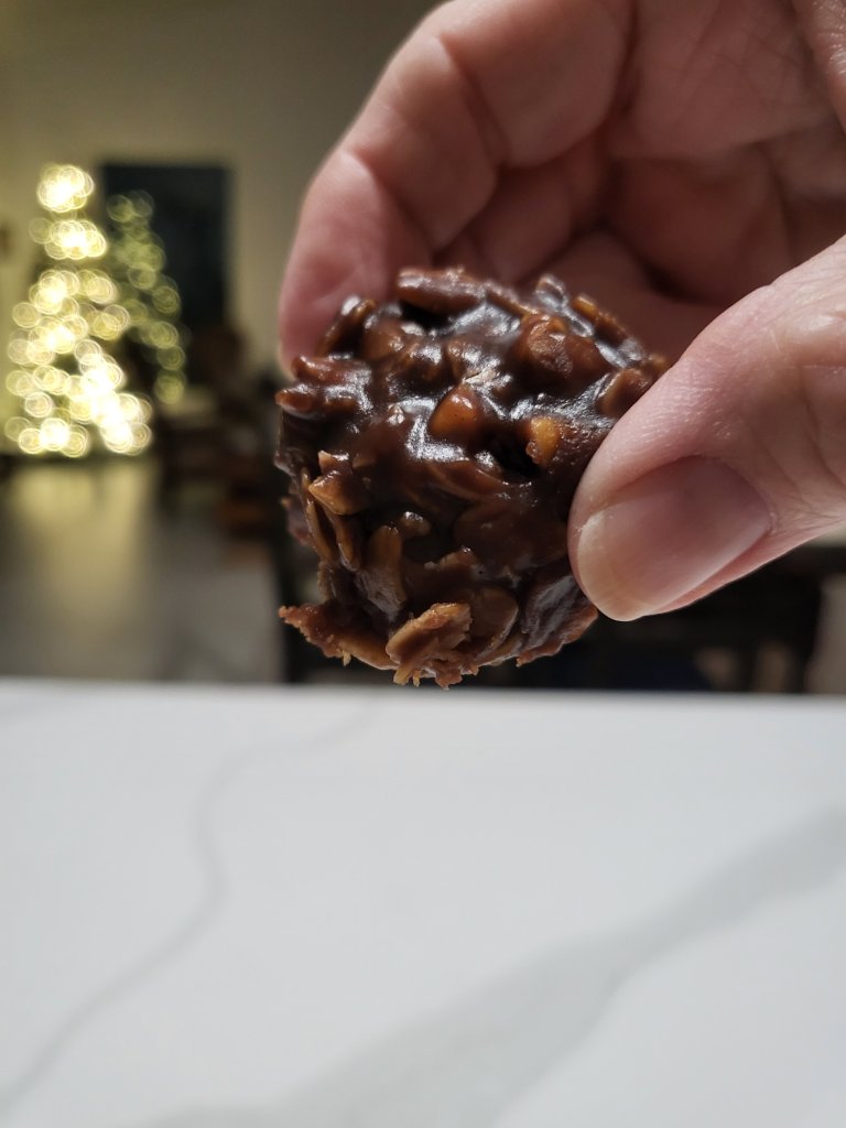 Add the first 6 ingredients to a large pan. Bring to a low boil, stirring occasionally for 1-2 minutes. Remove from heat; add in remaining ingredients and stir, stir, stir! Drop by mounded spoonful onto waxed paper-lined baking sheet; cool (or, you know, sample with a spoon for flavor correction 😉), eat and reminisce!